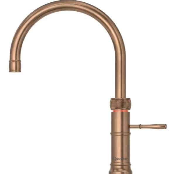 Quooker Classic Fusion Round – Inklusiv Pro3 beholder i bruneret messing er en elegant 3-i-1 kogende vandhane, der leverer koldt, varmt og kogende vand direkte fra samme hane. Med sit tidløse runde design og børnesikrede betjening gør den hverdagen i køkkenet både nemmere og mere sikker. Den energibesparende Pro3 beholder bruger kun ca. 55 øre i standby-strøm dagligt og passer perfekt under køkkenvasken.